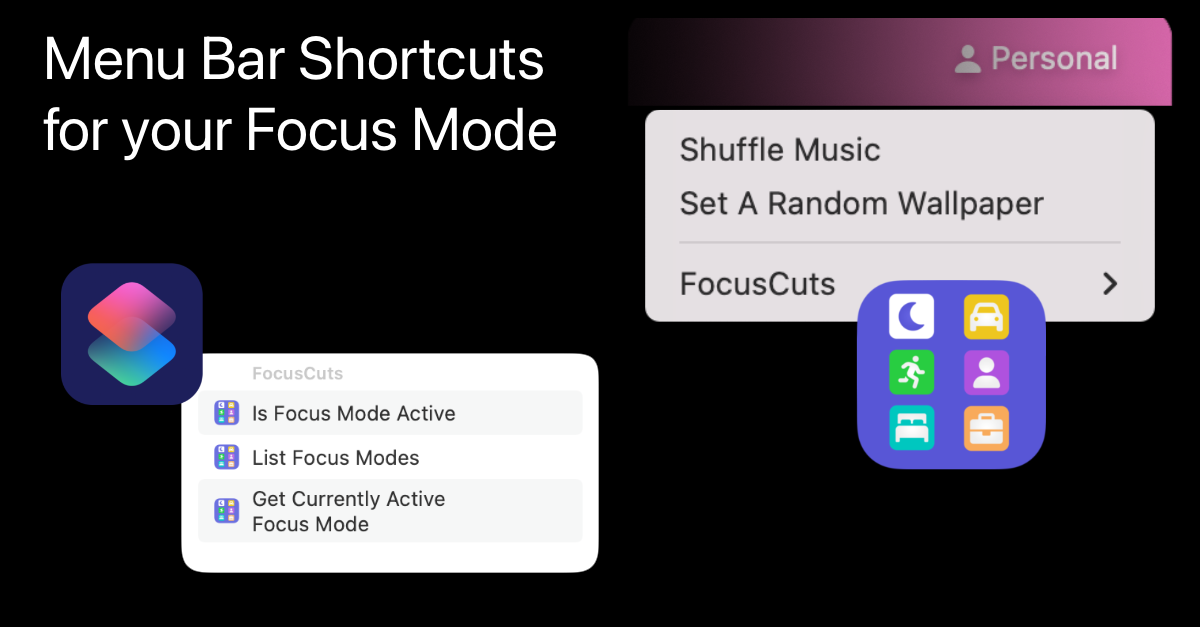 FocusCuts by Snailed It is a status bar application for macOS, which gives you additional actions for Shortcuts. FocusCuts also gives you a custom list of Shortcuts per Focus Mode. So if you want to have a quick list of Shortcuts available for Work, but different ones for Personal, you can!